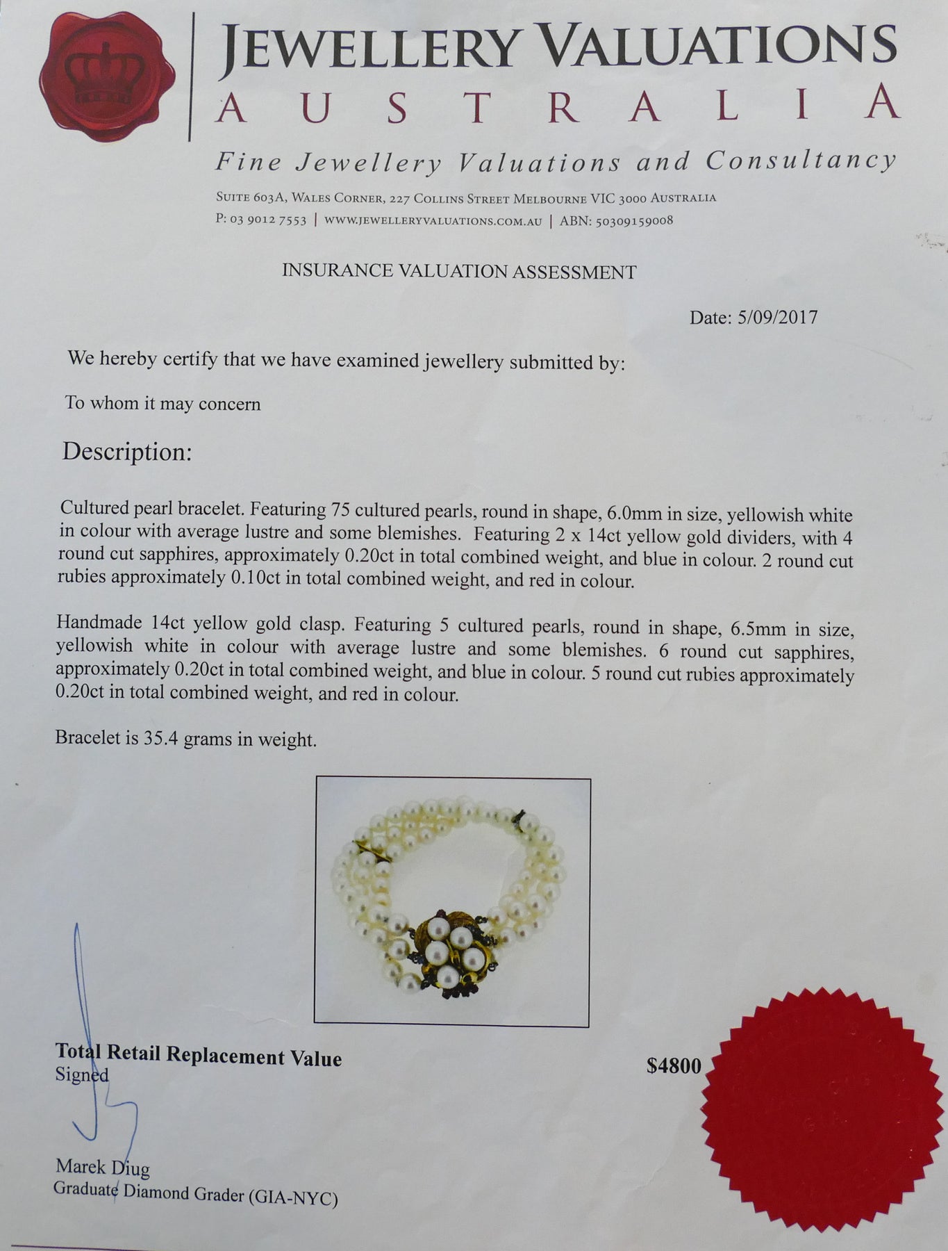 Regular price $2,890.00There are 75 Creamy white cultured Pearls in this pretty Bracelet. As well there are 14ct Yellow Gold Spacers and 4 round cut blue sapphires & 2 red Rubies.