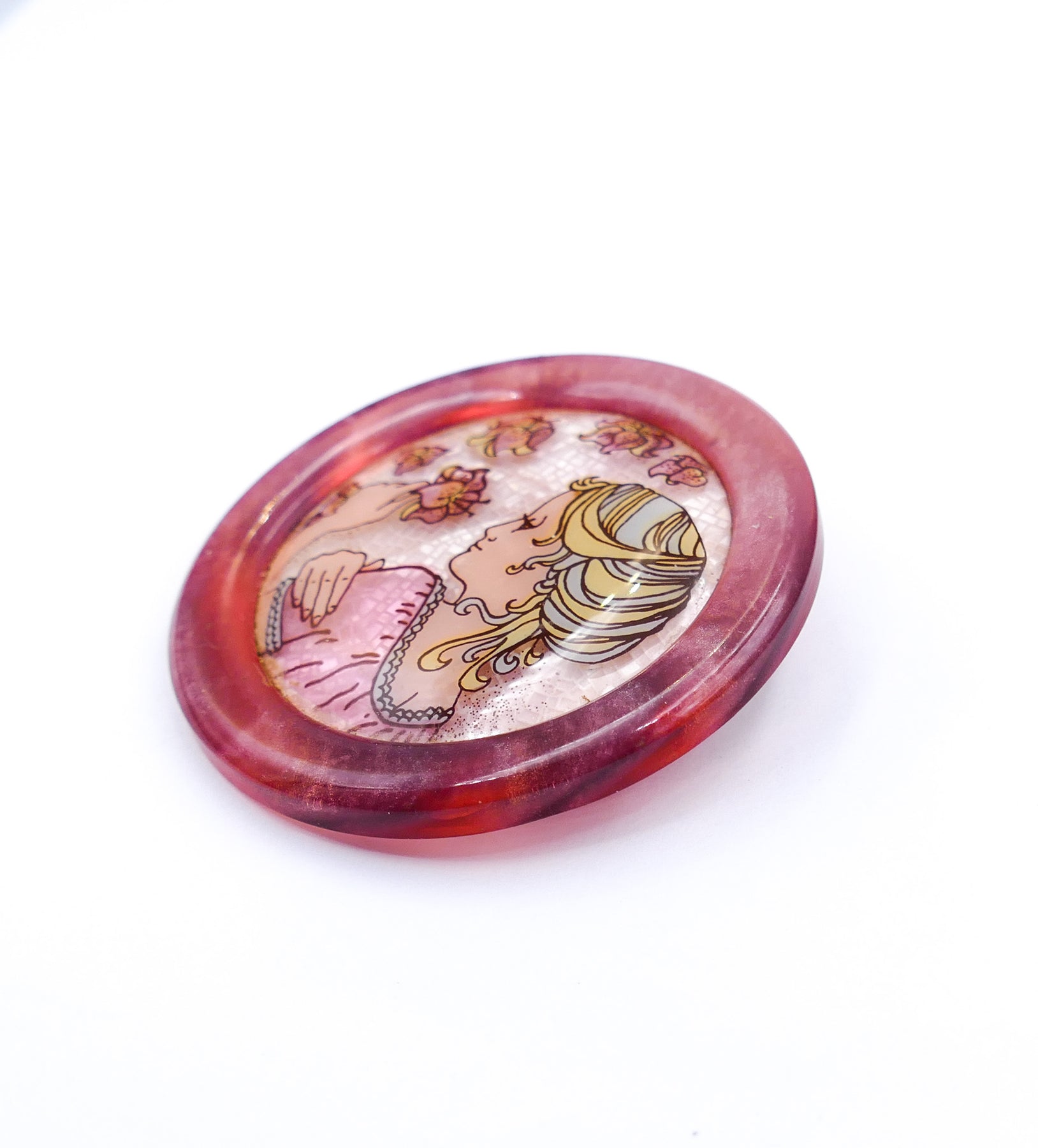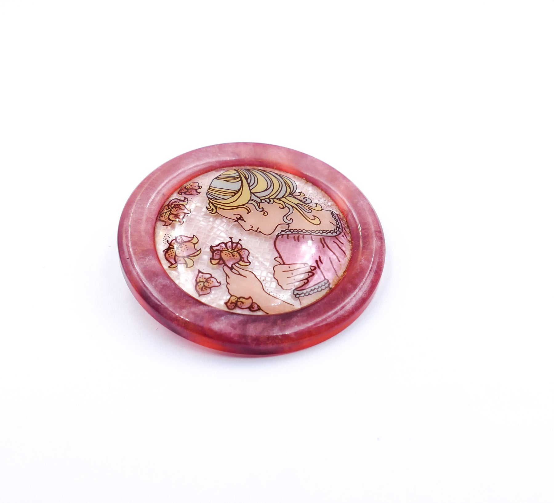 Our lovely pink lady is the centrepiece of this quite beautiful Serigraph (read silk screen work) Lea Stein Vintage and highly collectable Brooch.