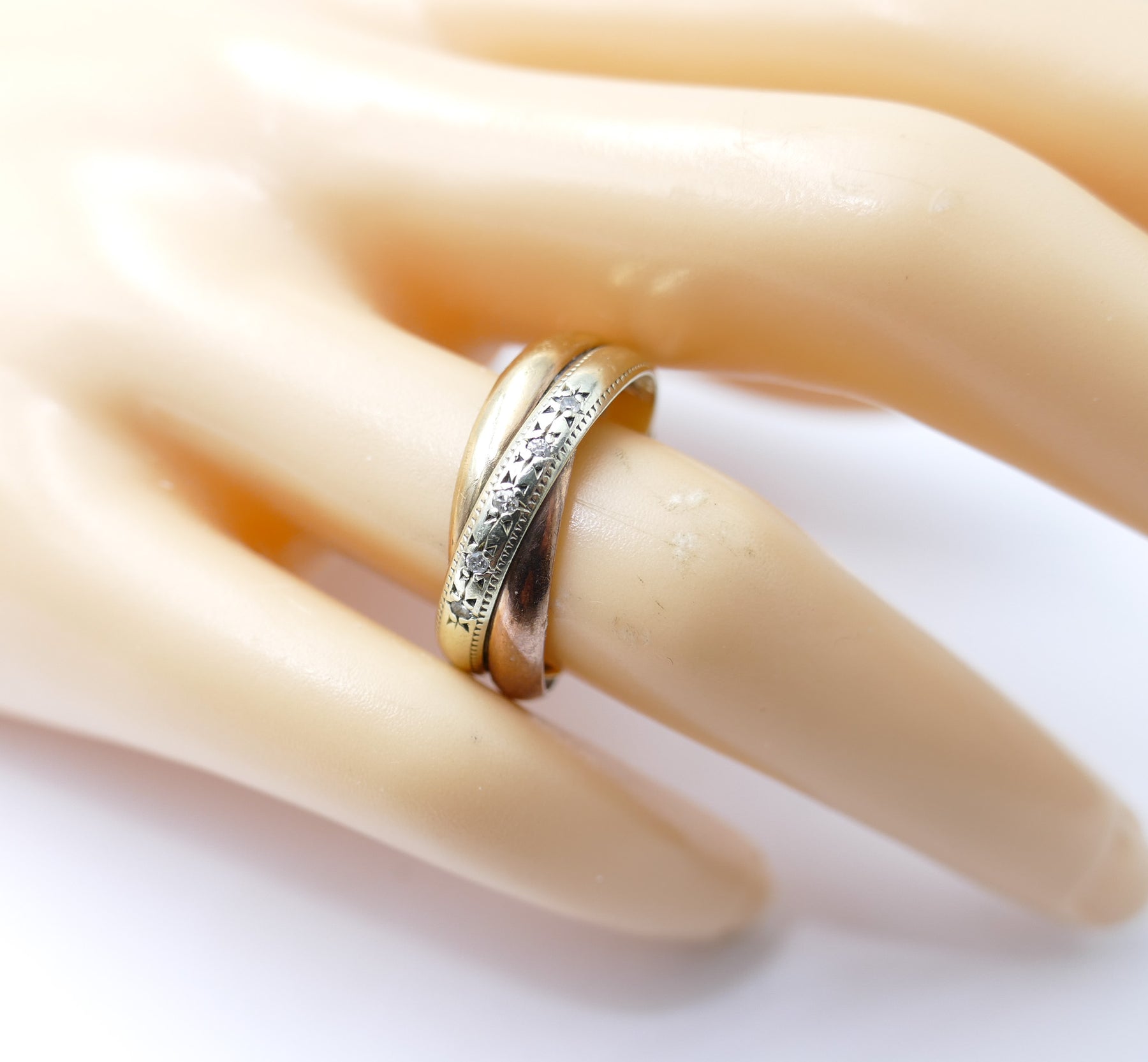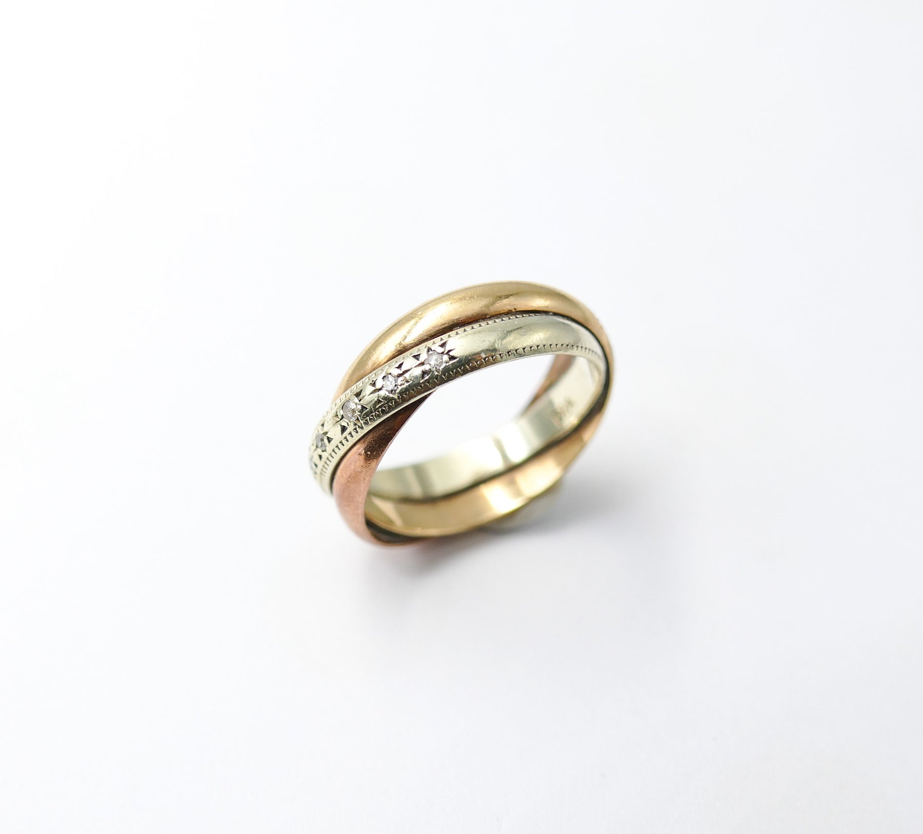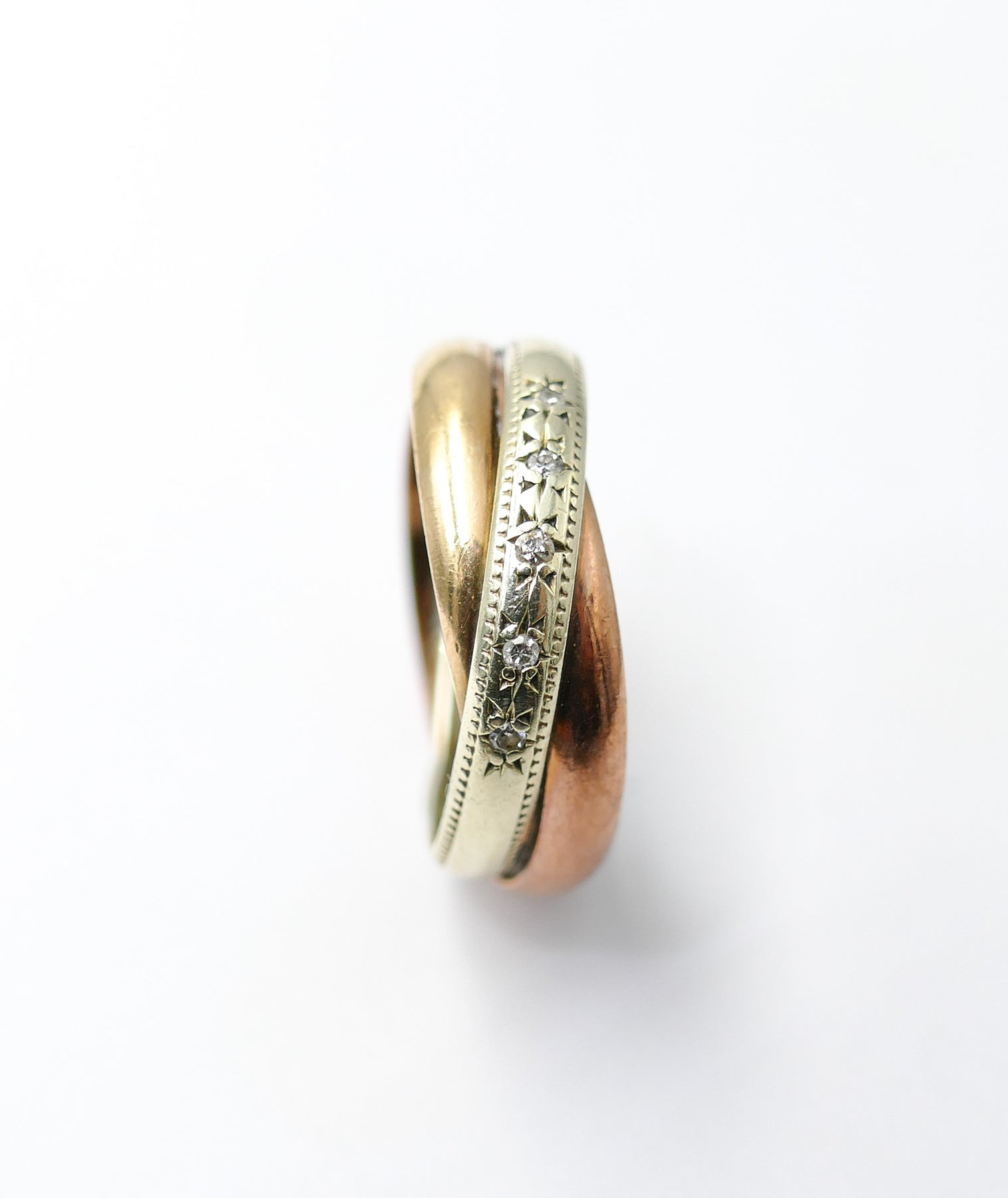 Mostly this type of Ring has the 3 colours of Gold - Yellow, Rose & White entwined - as this one does. It isn't too often though that the centre Ring is styled with Diamonds.
