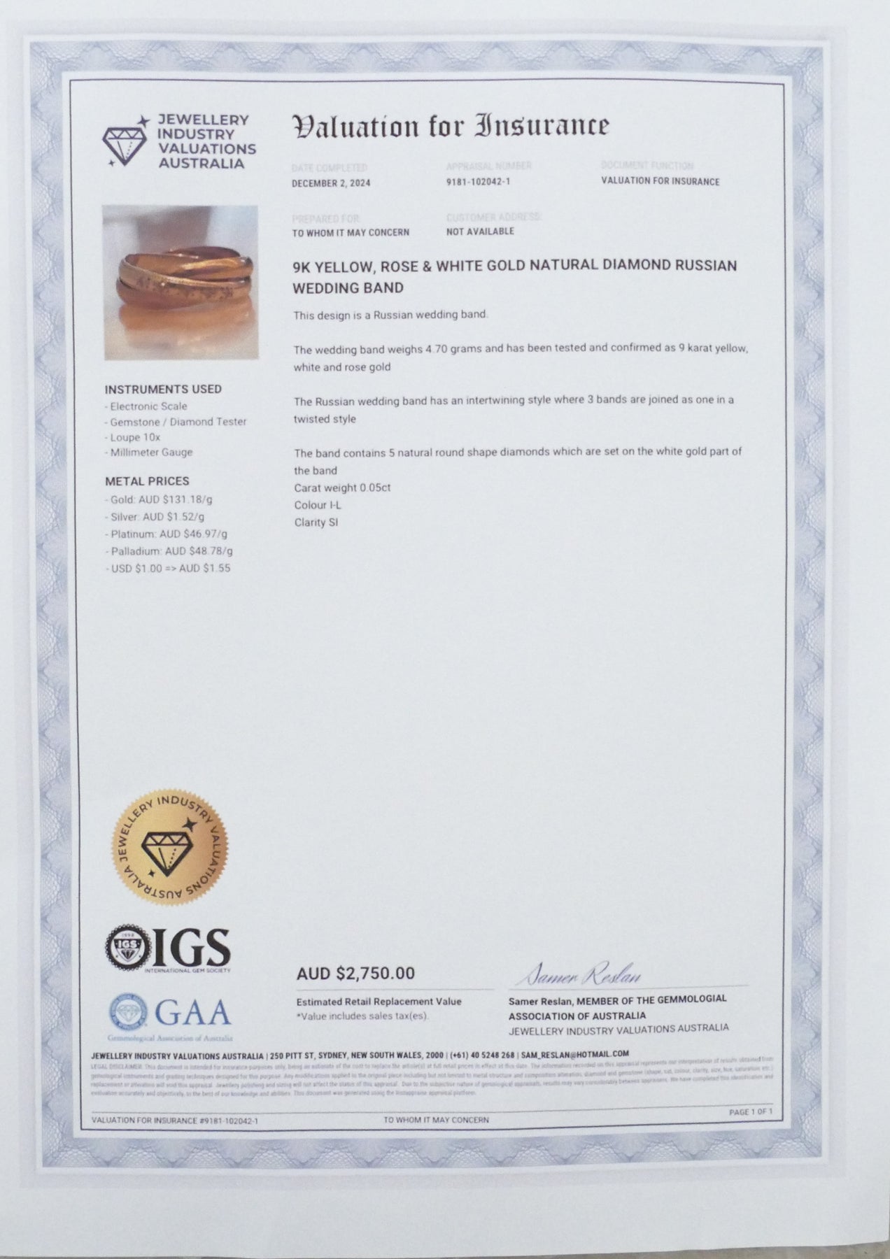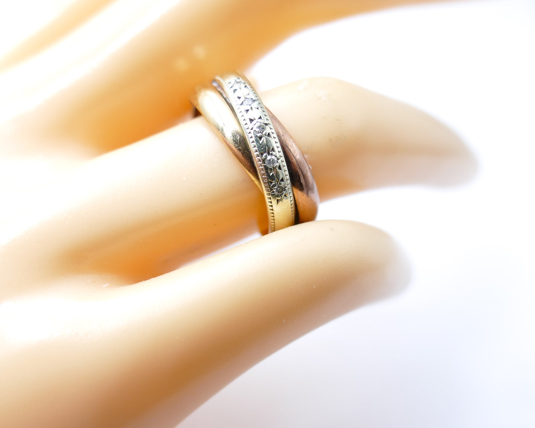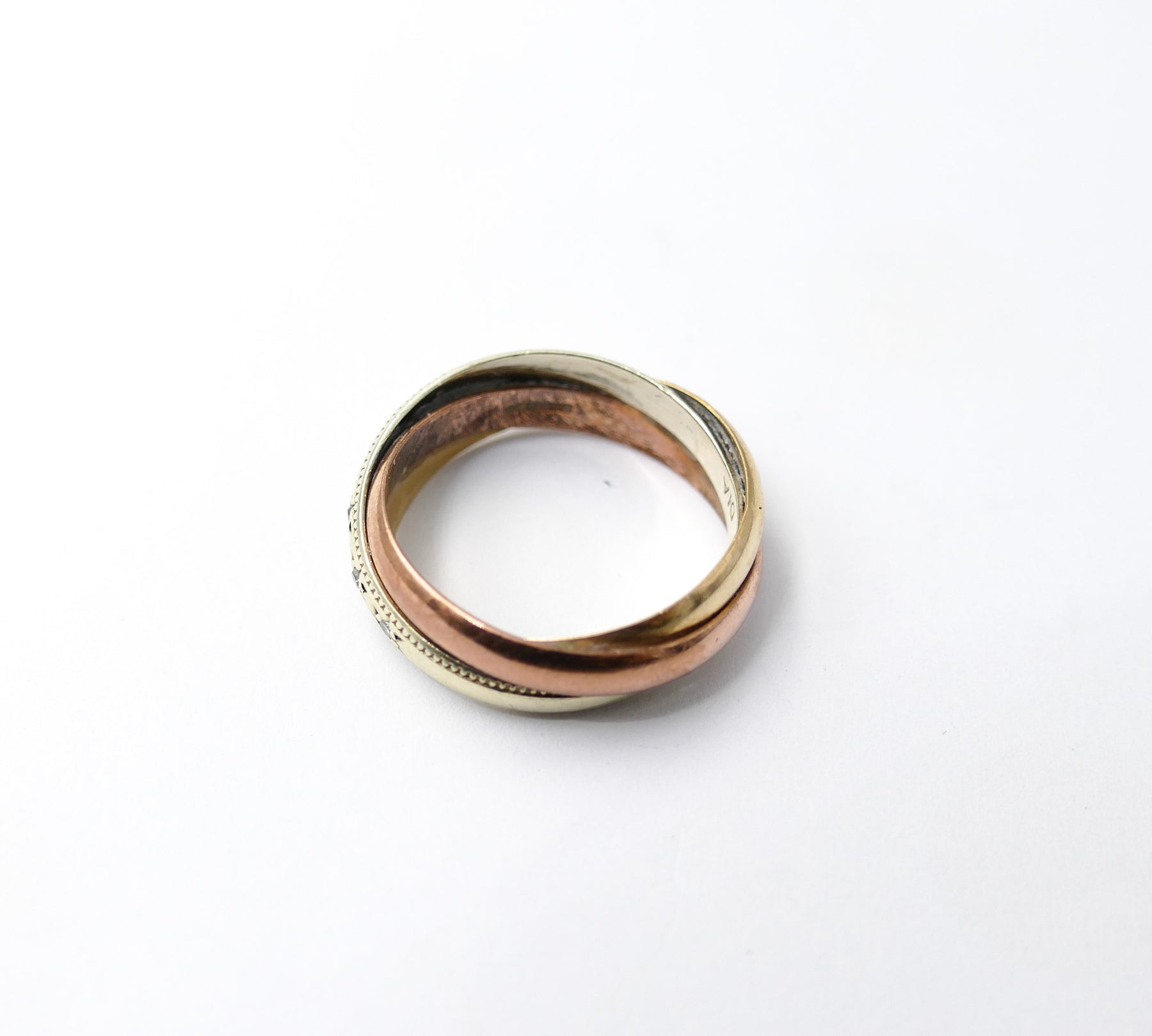Mostly this type of Ring has the 3 colours of Gold - Yellow, Rose & White entwined - as this one does. It isn't too often though that the centre Ring is styled with Diamonds.