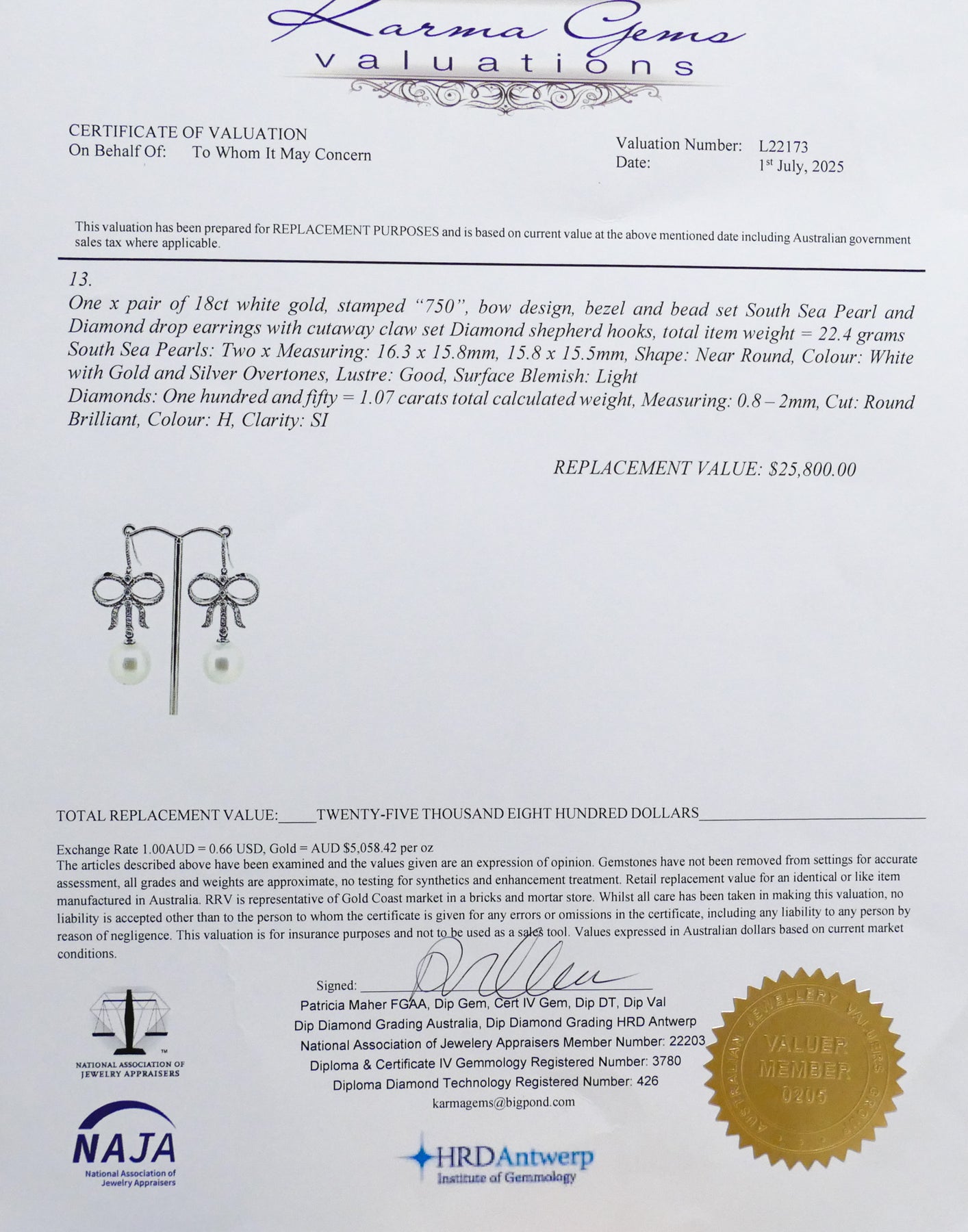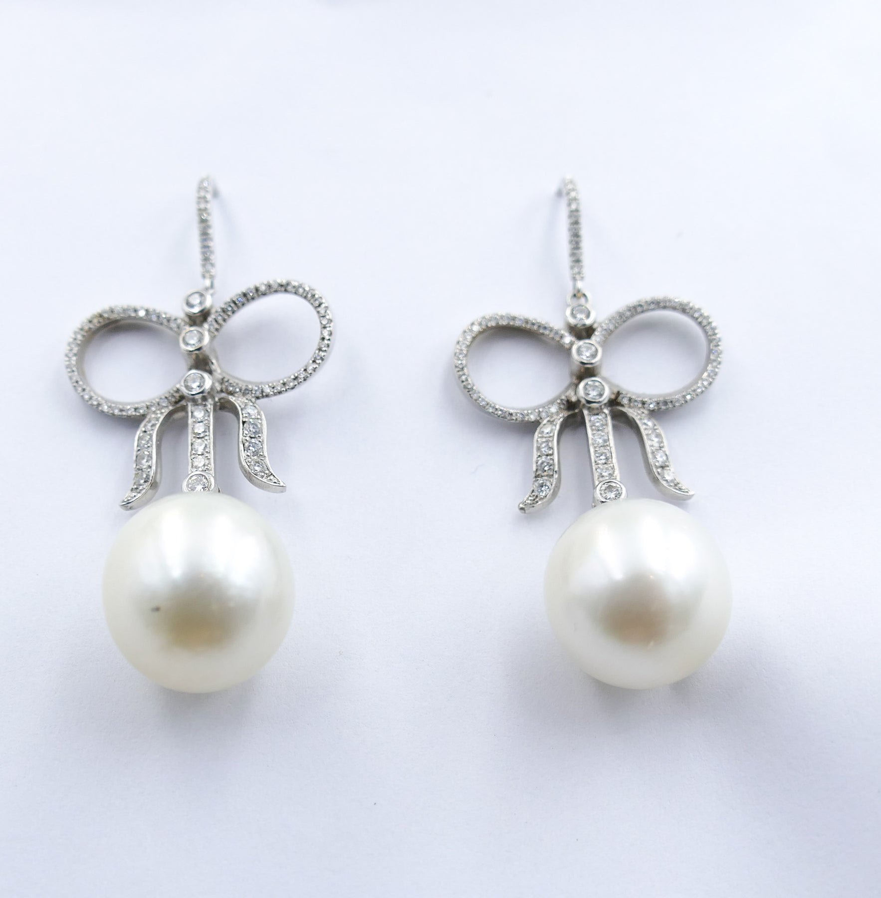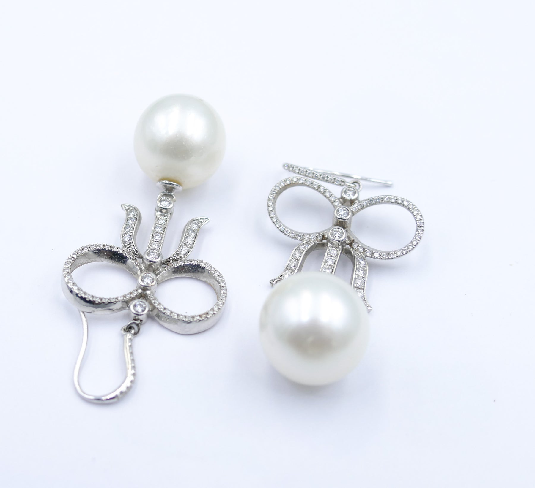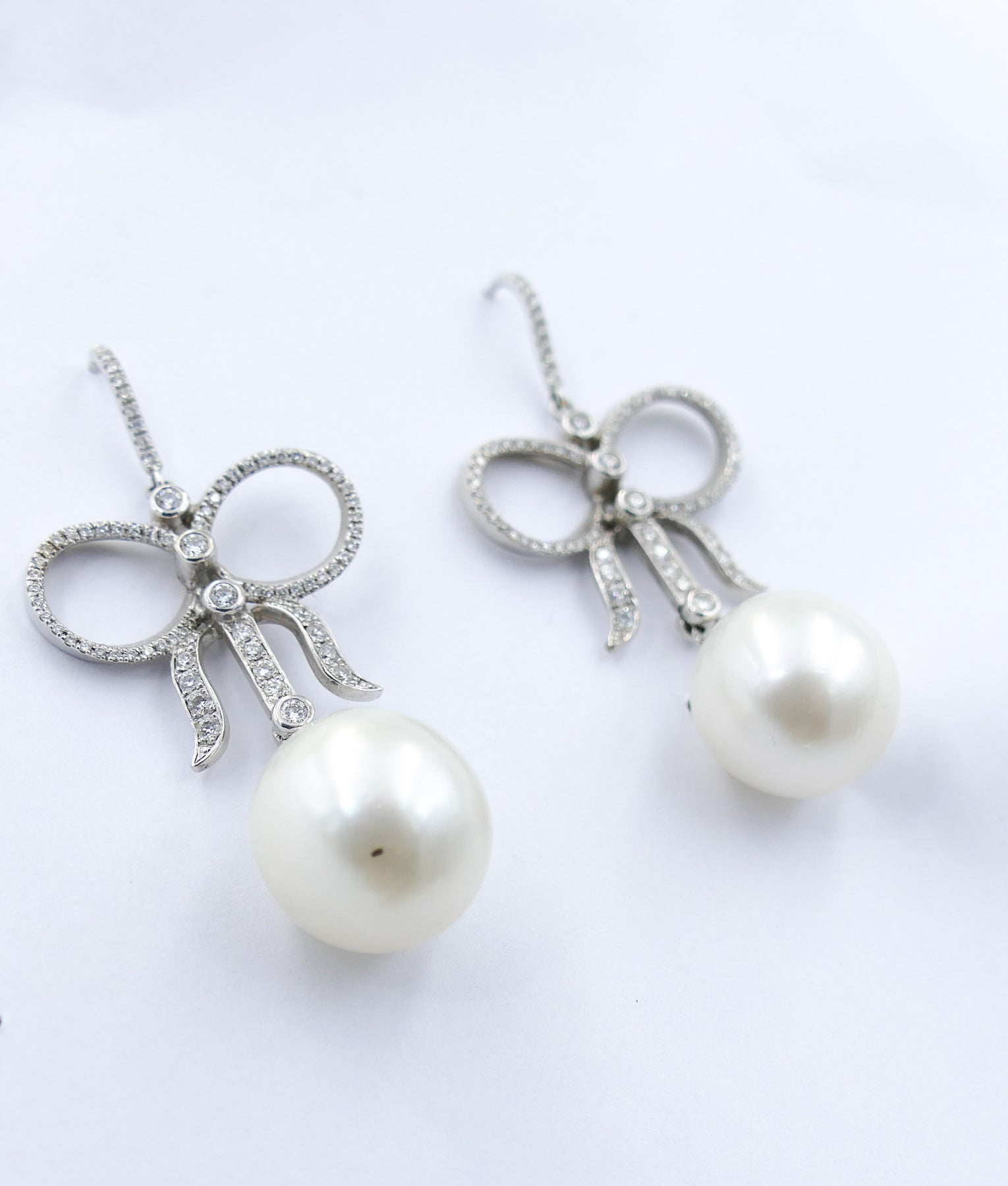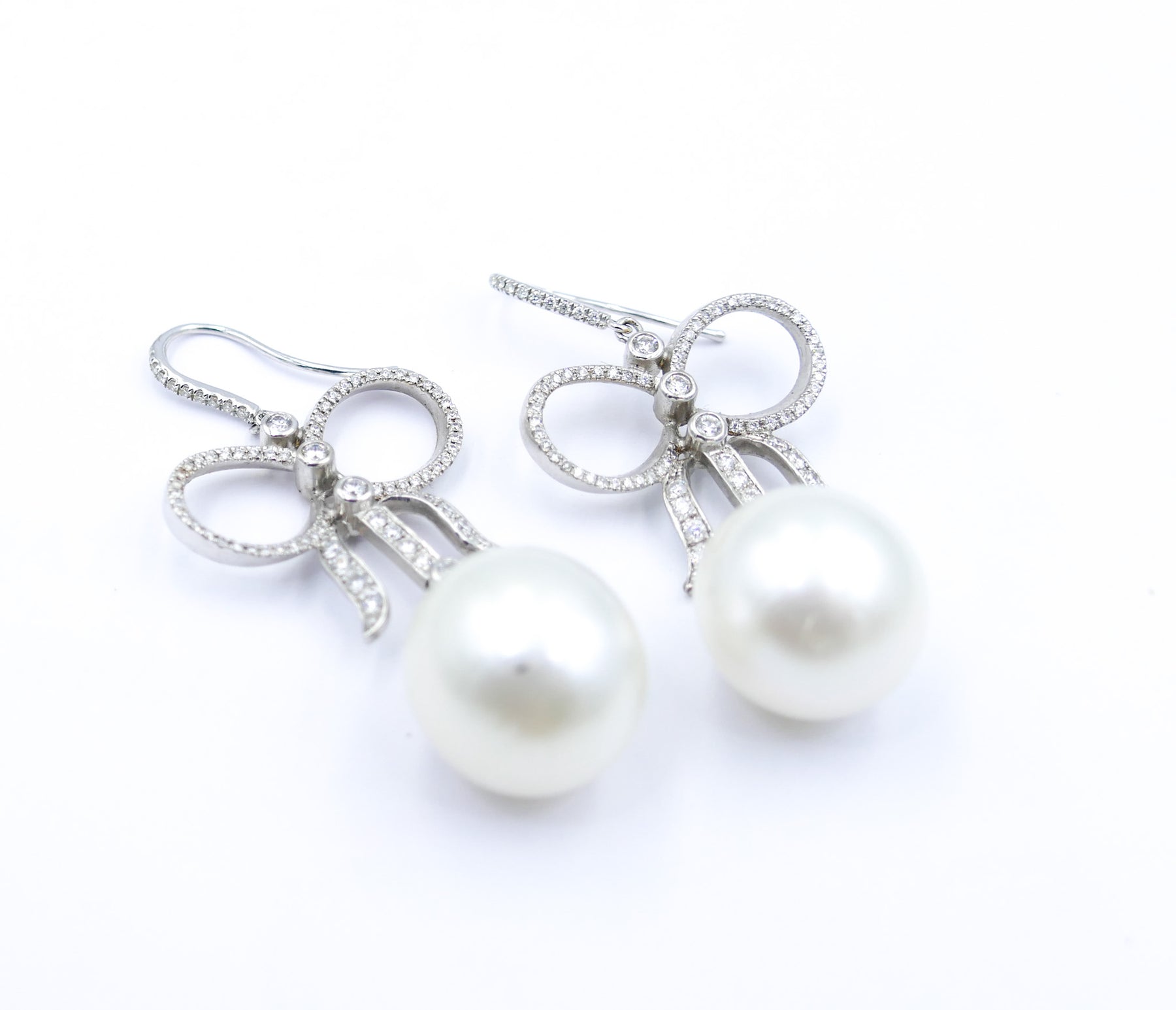 The style is very feminine with the Pearls being held in place by high level Diamonds styled into longish fashionable bows.